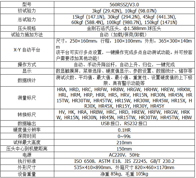 560RSSZ/V3.0全自動(dòng)洛氏硬度計(jì)外形新穎、功能齊全、操作方便、顯示清晰直觀、性能穩(wěn)定,是集機(jī)電于一體的高新技術(shù)產(chǎn)品。儀器取消了砝碼,采用電動(dòng)加卸試驗(yàn)力,可進(jìn)行洛氏、表面洛氏全部標(biāo)尺的硬度測(cè)試。該機(jī)器具有全自動(dòng)和人工操作功能,XYZ全自動(dòng)控制,適用于端淬試驗(yàn);外置PC電腦,具有數(shù)據(jù)統(tǒng)計(jì)功能,可以計(jì)算極值、平均值、標(biāo)準(zhǔn)偏差等,還能建立相應(yīng)的統(tǒng)計(jì)數(shù)據(jù)庫(kù)。統(tǒng)計(jì)數(shù)據(jù)庫(kù)允許輸入其它設(shè)備的檢測(cè)數(shù)據(jù),并可一并進(jìn)行統(tǒng)計(jì)分析?梢愿鶕(jù)用戶的要求自定義檢測(cè)報(bào)告,在報(bào)告中選擇所需的試驗(yàn)參數(shù)、試驗(yàn)結(jié)果以及圖表曲線;試驗(yàn)結(jié)果和測(cè)試報(bào)告均可進(jìn)行網(wǎng)絡(luò)傳輸,并允許其它計(jì)算機(jī)調(diào)用這些數(shù)據(jù),以便于實(shí)現(xiàn)網(wǎng)絡(luò)化管理。
