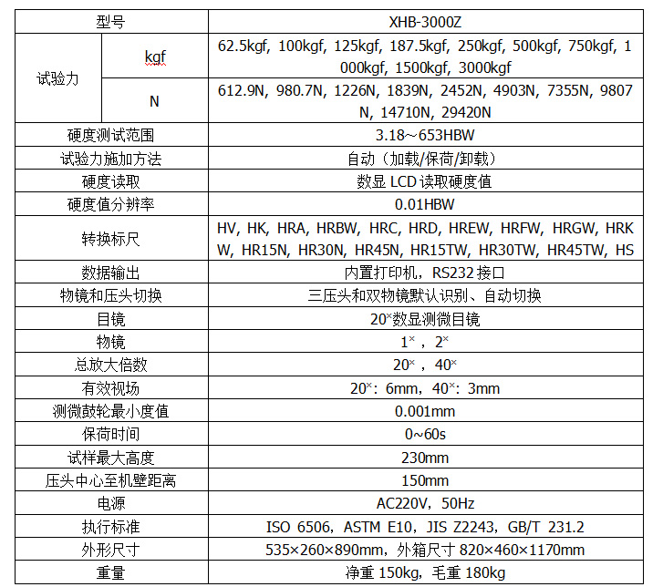 XHB-3000Z三壓頭數(shù)顯布氏硬度計(jì)采用精密的結(jié)構(gòu)設(shè)計(jì),試驗(yàn)力施加由力傳感器直接控制,使整機(jī)結(jié)構(gòu)緊湊,加卸試驗(yàn)力平穩(wěn)、準(zhǔn)確。在電氣上由CPU控制試驗(yàn)過(guò)程,物鏡和壓頭間采用自動(dòng)切換,切換定位采用機(jī)械與電子雙重配合,使定位精度更高。本儀器具備10級(jí)試驗(yàn)力,13種布氏硬度的測(cè)試標(biāo)尺,可任意選擇;具備了三個(gè)壓頭和兩個(gè)物鏡,都能自動(dòng)參與測(cè)試,物鏡和壓頭間默認(rèn)識(shí)別、自動(dòng)切換;可預(yù)置試驗(yàn)力保持時(shí)間、調(diào)節(jié)測(cè)量壓痕光源的強(qiáng)弱;顯示測(cè)量壓痕長(zhǎng)度、硬度值、測(cè)量次數(shù)等;具備硬度標(biāo)尺轉(zhuǎn)換功能;數(shù)據(jù)結(jié)果可以保存并通過(guò)表格查看,也可通過(guò)內(nèi)置打印機(jī)輸出,并配有RS232接口供用戶連接電腦輸出。硬度計(jì)還可根據(jù)用戶特殊需求配置視屏測(cè)量裝置和CCD圖像自動(dòng)測(cè)量系統(tǒng)。