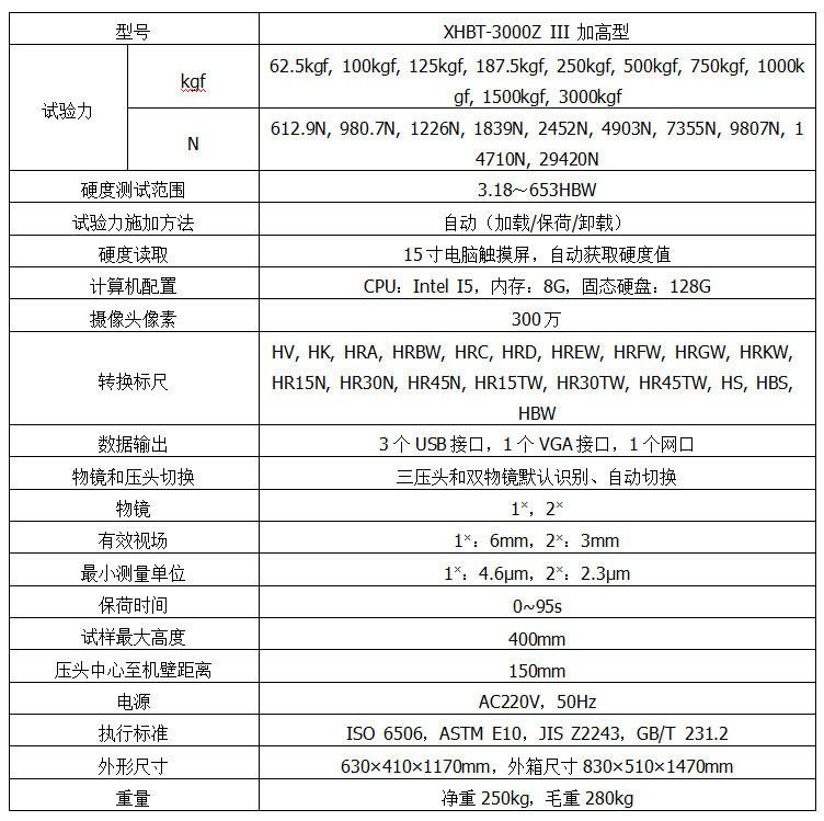 XHBT-3000Z III全自動(dòng)三壓頭數(shù)顯布氏硬度計(jì)采用精密結(jié)構(gòu)設(shè)計(jì),試驗(yàn)力施加由力傳感器直接控制,使整機(jī)結(jié)構(gòu)緊湊,加卸試驗(yàn)力平穩(wěn)、準(zhǔn)確。在電氣上由CPU控制試驗(yàn)過(guò)程,物鏡和壓頭間采用自動(dòng)切換,切換定位采用機(jī)械與電子雙重配合,使定位精度提高。內(nèi)置觸摸屏,微型電腦,使參數(shù)設(shè)定、結(jié)果顯示更加直觀,操作更加便捷,也避免了顯微鏡的光源給眼睛帶來(lái)的刺激和視覺(jué)疲勞,減少了測(cè)量誤差。選擇相應(yīng)的標(biāo)尺開(kāi)始后,硬度計(jì)將自動(dòng)選擇壓頭及物鏡,平臺(tái)自動(dòng)上升,施加完試驗(yàn)力后自動(dòng)回到聚焦面,壓痕清晰顯示并自動(dòng)測(cè)量,實(shí)現(xiàn)了布氏測(cè)量的全自動(dòng)化。此款為加高型,適用于更多大型工件測(cè)定的需求。